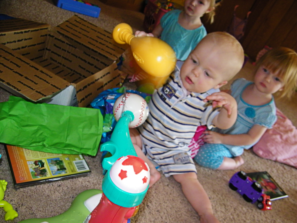 Little Tommy Boy had his first birthday last Sunday! He was adorable. He's such a big boy and developing such a personality, especially when his sisters are bugging him. We had a small dinner/party for him here at home with some of his cousins. The main event was most definitely the cake! He LOVED it. He's been the best 1st birthday cake eater that we've had so far in our family. The girls were so delicate and hesitant, but Thomas knew exactly what he wanted and boy did he want it. It was also so fun to watch him with his presents. He got some fun balls and a bat and baseball toy. He's never used a bat before but the second he pulled it out he knew exactly how it was supposed to be used. He started wacking the baseball immediately. It was so funny! What a little boy we have and I love it! He's also really into pushing things across the floor. If it rolls/moves he pushes it :) So, I'd say it was a successful first birthday. We had lots of fun with our little guy.